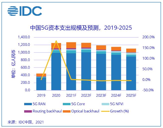 根據(jù)市場(chǎng)的變化和調(diào)整,IDC更新了《中國(guó)5G資本支出預(yù)測(cè),2021–2025》報(bào)告,并從5G 無線接入網(wǎng)、5G核心網(wǎng)、5G網(wǎng)絡(luò)功能虛擬化基礎(chǔ)設(shè)施、5G數(shù)據(jù)通信和5G光回傳等5維度對(duì)5G支出進(jìn)行細(xì)化和展望。